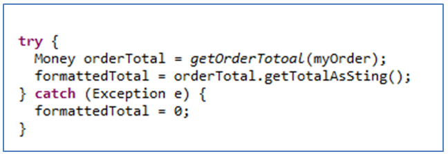 In the above example the ‘getTotalAsString’ method should be modified to return ‘0’ instead of throwing an exception. This way we can write code like: