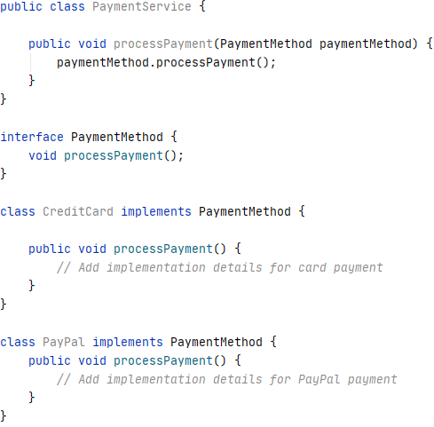This implementation breaks the open closed principle because the PaymentService is not open for extension. By that we mean, what happens if we want to extend the code to allow a new payment type such as PayPal. We would have to modify the class to write a new method like `processPaymentWithPaypal` hence breaking the open for extension and closed for modification.