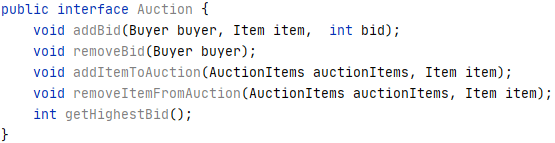 Breaking Implementation: Here we have an interface for the Auctions; it combines the bidding on an auction and the adding of an item to an auction. Conceptually these two actions should be separated into their own interfaces. More importantly, if we want to include different types of Auction (e.g.  Standard Auction, Buy Now Auction) we should not have to duplicate the code for adding/removing an auction item for both implementations.