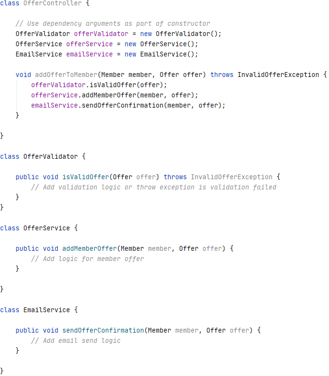 Breaking Implementation: This implementation breaks the single responsibility principle because this class is responsible for doing many tasks including validation, offer assignment and sending confirmation email.