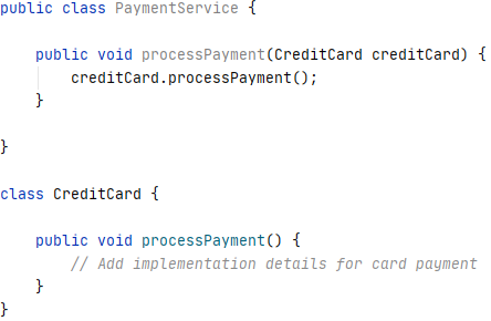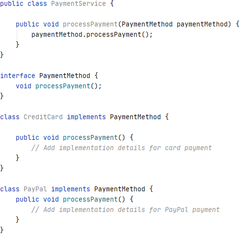 This implementation breaks the open closed principle because the PaymentService is not open for extension. By that we mean, what happens if we want to extend the code to allow a new payment type such as PayPal. We would have to modify the class to write a new method like `processPaymentWithPaypal` hence breaking the open for extension and closed for modification.