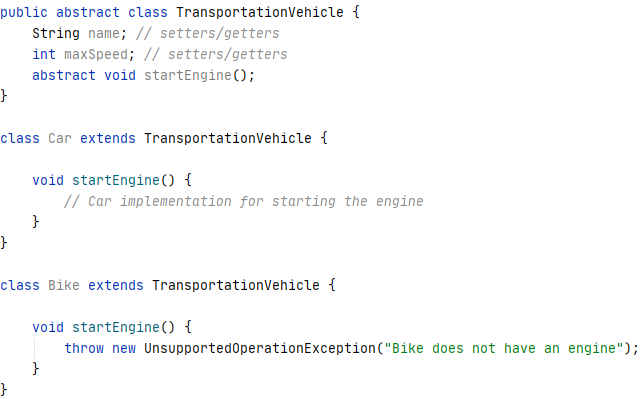 Adhering Implementation:  In the above case the wrong abstraction was choosen. One way to solve this problem is to remove the startEngine() method from TransportactionVehicle and to write a new abstract class called EnginePoweredTransportactionVehicle that extends the TransportactionVehicle. Therefor the bike classes, or any other transportation vehicles that do not use an engine, can extend the transportation vehicle without needing to implement any engine methods.