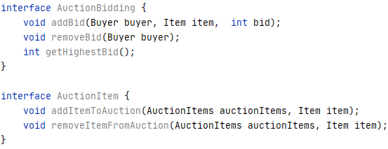 Breaking Implementation: Here we have an interface for the Auctions; it combines the bidding on an auction and the adding of an item to an auction. Conceptually these two actions should be separated into their own interfaces. More importantly, if we want to include different types of Auction (e.g.  Standard Auction, Buy Now Auction) we should not have to duplicate the code for adding/removing an auction item for both implementations.