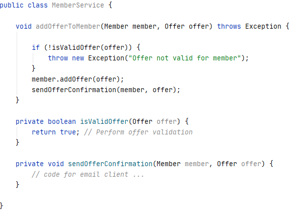 Breaking Implementation: This implementation breaks the single responsibility principle because this class is responsible for doing many tasks including validation, offer assignment and sending confirmation email.